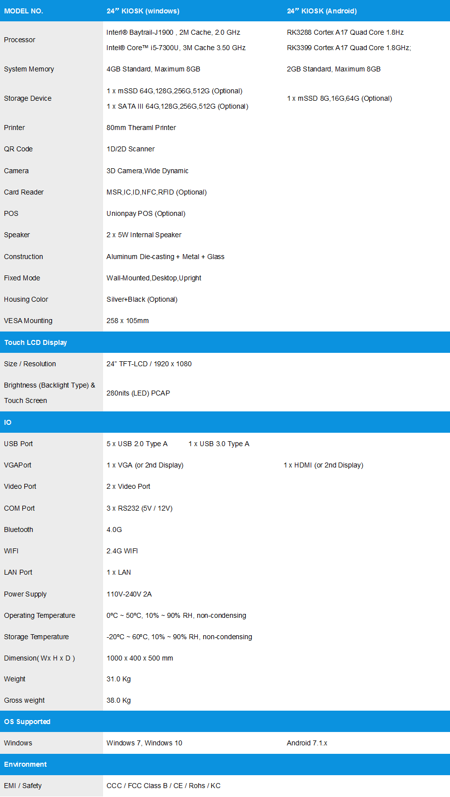 Optional accessories: QR code scanner, card reader NFC, 58/80mm thermal printer